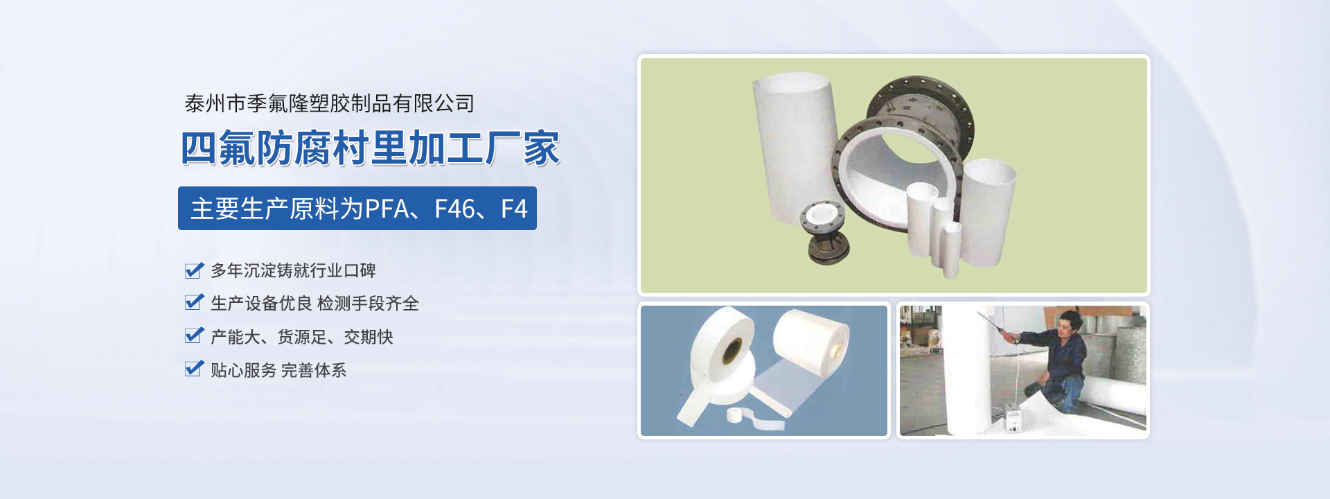 泰州市季氟隆塑膠制品有限公司(江蘇斯瑞沃爾科技發(fā)展有限公司)占地8000平方米,各類專用生產(chǎn)設(shè)備三十多合,現(xiàn)有員工近20人,其中技術(shù)人員10名,均多年從事該行業(yè)生產(chǎn),經(jīng)驗豐富。本公司主要生產(chǎn)原料為PFA、F46、F4,主要為電磁傳感器、防腐管道、各種容器反應釜三通四通彎頭及各種閥門等產(chǎn)品進行防腐村里加工,長期為德國、日本、美國、新加坡等國在華合資公司配套,產(chǎn)品廣泛應用于環(huán)保、油田、化工、造紙、冶金等行業(yè),產(chǎn)品質(zhì)量優(yōu)良,服務(wù)及時周到,一直深受顧客信賴。
